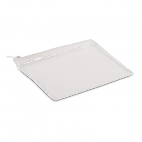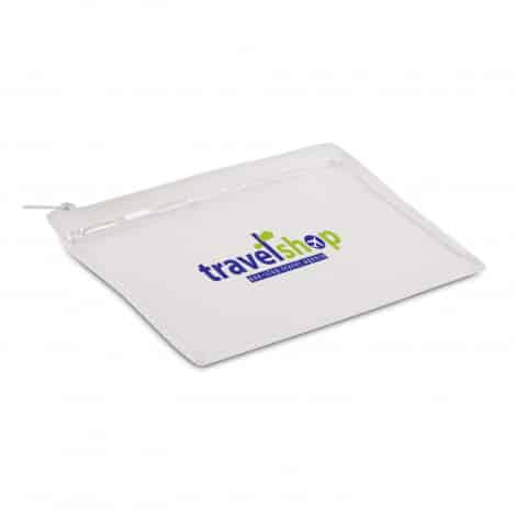 Transparent bag with a sliding closure suitable for carrying personal items when flying.