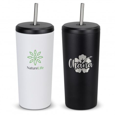 - Secure screw on lid with a silicone seal and stainless steel straw