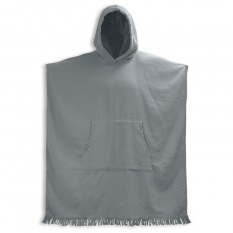 Convenient hooded towel made of 320GSM, 100% cotton. With a fringe trim and kangaroo pocket, this towel is both absorbent and stylish. It has side snaps, terry on the inside, and a flat weave on the outside.