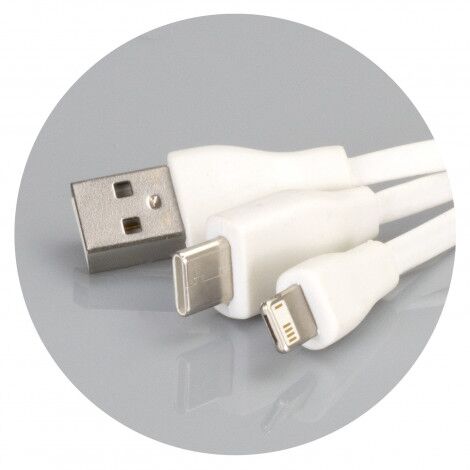 A handy mobile charging cable key ring for phones, tablets, cameras, GPS etc. It offers three different connectors in one compact bamboo unit, a USB, Type-C, and a Lightening that can be flipped over to be a Micro-B. This device is for charging only and is not designed for data connections. Bamboo is a natural material and because the plant is fast growing, it places less demands on natural resources and produces a material that is durable and versatile. Bamboo can also produce unavoidable variances in the grain pattern, colour and branding. It laser engraves to a natural etch.