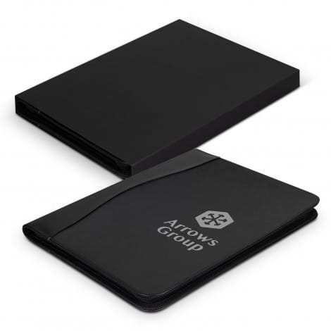 A sophisticated leather portfolio made of bonded leather. It has a zippered closure and a curved front design. A large document slip pocket, A4 lined paper, and internal compartments for a pen, power bank, phone, tablet, and business card are included in the portfolio.