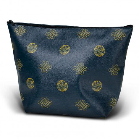 Medium cosmetic bag manufactured from leather look PU and is branded in full colour on both sides with no extra cost. Belle has a black zipper and the stitching matches the zip colour. A production lead time of 25 working days applies to this product.