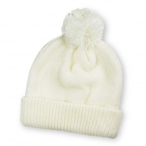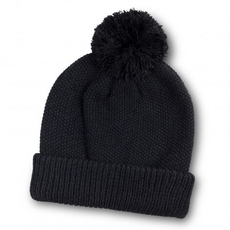 Versatile acrylic double-knit beanie, known for its soft and durable fit. It features a cuff and a pom-pom on the top, and is one size fits.