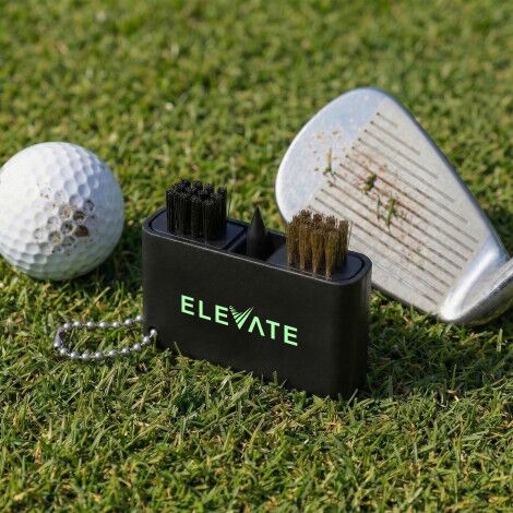 The Caddie Golf Club Cleaning Tool is a golfer’s practical companion. The nylon brush is ideal for light cleaning of woods and irons, while the copper brush tackles deeper cleaning and stubborn debris from irons and wedges. An appointed groove cleaner ensures your grooves stay in top condition, while a convenient keychain attachment keeps the tool close at hand. Perfect for golfing promotional giveaways. Presented in a natural kraft gift box.
