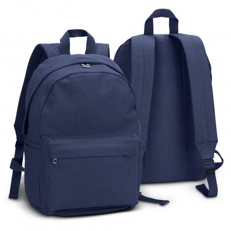 Affordable backpack which is manufactured from 450gsm heavy cotton canvas. It has a zippered main closure and adjustable woven shoulder straps with padding. Other features include an internal slip pocket for a laptop, a large zippered front pocket, a woven carry handle and two side pockets which double as a drink bottle holder.