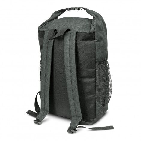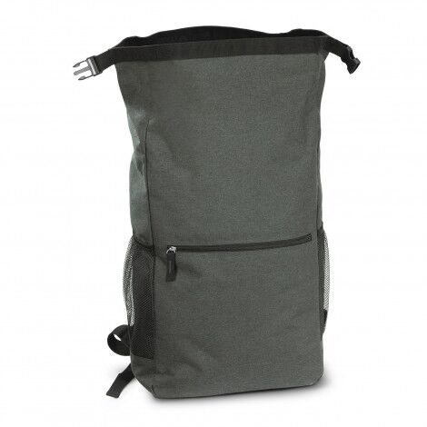 Large backpack which is manufactured from smart 300D polyester with a padded 600D polyester back panel for comfortable carrying. It has 210D polyester lining and a roll top closure with a secure snap lock. Other features include an internal slip pocket that fits a 17 inch laptop or a tablet, a large zippered external pocket, two mesh side pockets, a carry handle and adjustable shoulder straps which are padded.