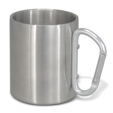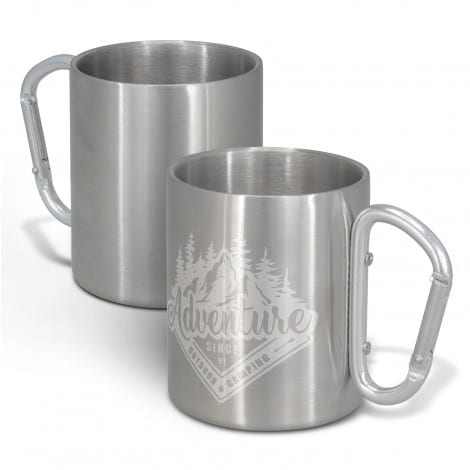 Lightweight 300ml coffee mug which is manufactured from BPA-free stainless steel which laser engraves to a natural etch. It features an aluminium carabiner handle to easily attach the mug to backpacks and bags, perfect for camping and day trips. This product is not dishwasher safe and handwashing is recommended.
