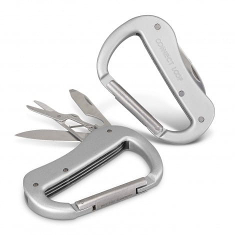 Handy five-function stainless steel multi-tool which includes a carabiner for attaching the tool to a belt or a bag. The carabiner laser engraves to a natural etch.
