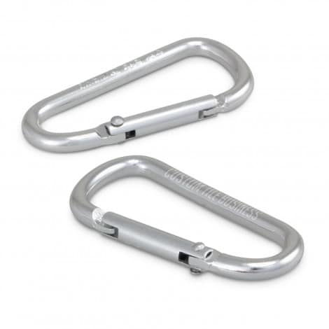 Promotional stainless steel carabiner for attaching to many different items. It laser engraves to a natural etch and is not suitable for climbing applications.