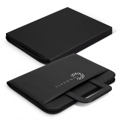 Travel-inspired portfolio case made of PU with foldaway handles. It has a zipped closure as well as two external and three internal document slips. Internal pen loops, a passport/ticket holder, a tablet slip pocket, and six business card holders are also included in the portfolio.