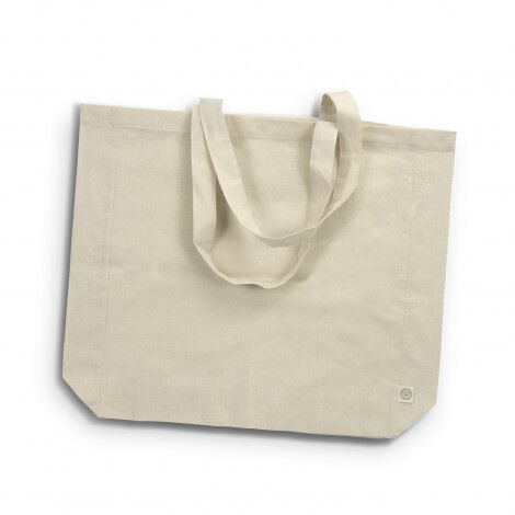 This stylish and environmentally conscious 13L tote bag is made from 100% recycled, unbleached natural cotton. It features a base gusset for extra capacity and long handles for easy shoulder carrying.