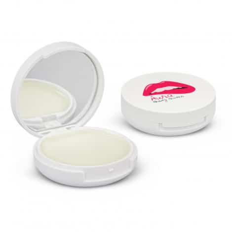 Handy compact mirror with a hinged lid and 7g of lip balm. It has an ingredients label on the base.