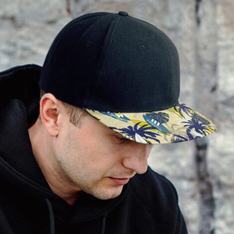 Premium structured five panel cap which is made from cotton twill. It has a flat peak which is fully customisable with edge-to-edge full colour print on top and a choice of 12 colours underneath. The hat also features embroidered eyelets, a sweatband and an adjustable snap back closure that allows one size to fit most people. Embroidery is available for an additional charge. A production lead time of 35 working days applies to this product by air freight and larger orders can be sea freighted on request to reduce the freight cost.