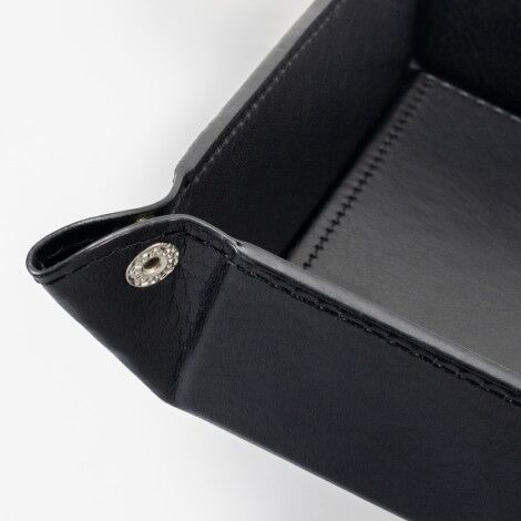 Compact valet tray made from stylish leather-look PU. This versatile tray easily collapses and can be reconstructed using snap fasteners, and is ideal for holding keys, trinkets or playing dice games.