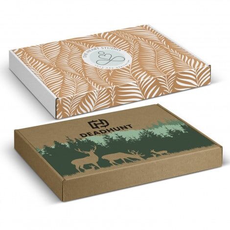 Professional custom gift box made from durable 1.5mm e-flute corrugated cardboard to provide reliable protection during transit. This box is perfect for gifting and building strong brand recognition. Featuring a convenient hinged lid, selected panels of the box can be customised with CMYK digital print. It is supplied flat-packed for easy postage and storage, and its self-locking design ensures hassle-free assembly. The assembled internal dimensions are 320mm x 230mm x 35mm (LxWxH).