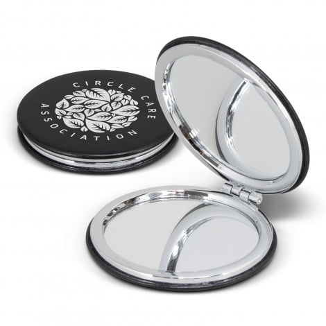 Compact mirror with a hinged cover and black PU exterior. Essence features two mirrors with one being a magnification mirror.