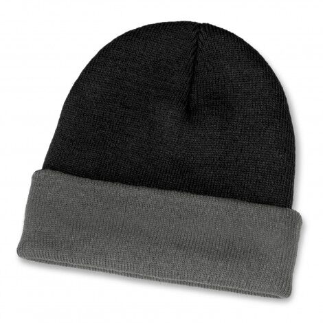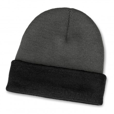 Warm knitted acrylic two-tone beanie with a roll up cuff. It is available in one size which will fit most people.