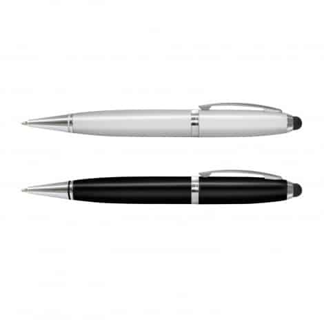 Twist-action brass ballpoint pen with a built-in 4GB flash drive. The pen has 500m of black ink, a stylus for use on touch screens and shiny chrome accents. The flash drive has a USB 2.0 interface, a read speed of 5MB/s and a write speed of 3MB/s, and data uploading is available on request. The pen can be presented in an optional pen sleeve or gift box.