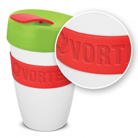 Sophisticated 340ml double wall reusable coffee cup which will keep drinks hot for longer and remain comfortable to hold. It has a decorative silicone band and a secure screw on lid with a splashproof flip closure. Express Cup is manufactured from BPA-free polypropylene which is shatterproof and odour-resistant. The cup, lid, flip closure and silicone band can be mixed and matched in any colour combination from the colour palette at no extra cost. Up to five different colour combinations are included in the price and more are available for an additional charge. An optional natural gift box is available on request. This product is not dishwasher safe and handwashing is recommended. Express Cup Double Wall is protected under New Zealand Design Registration No. 419451 and Australian Design Registration No. 361937.