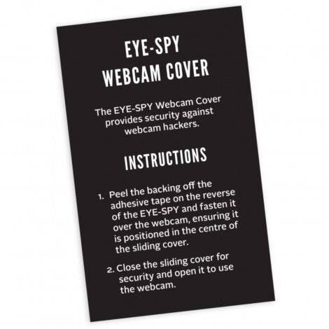 The FBI recommends covering laptop webcams when not in use for security reasons. The Eye-Spy webcam cover is easily installed and provides security against webcam hackers. It has a sliding cover that is closed for security and opened to use the webcam. Eye-Spy is presented with an instruction card in a resealable bag.