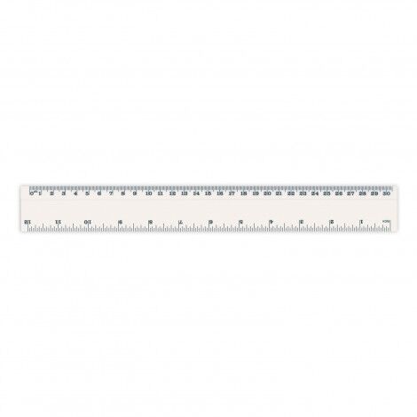 Plastic 30cm ruler with graduations in both centimetres and inches. It has a recessed bottom edge that flips the ruler up when pushed so it is easily picked up from a flat surface.