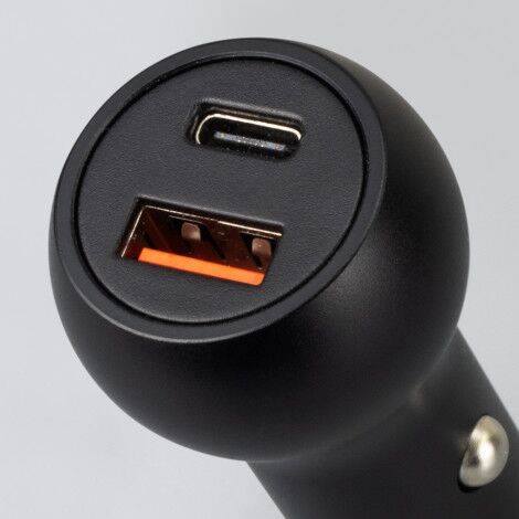 Handy car charger with dual charging ports and a built-in safety hammer for emergencies. Gideon can charge two devices simultaneously via a USB-A port and a Type-C port.