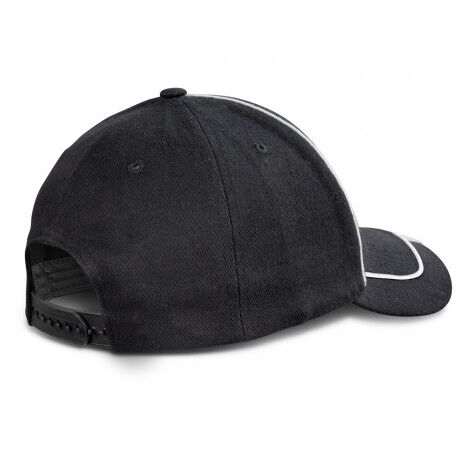 Fully customisable six-panel cap which is made from cotton twill and features an embroidered design on the peak and piping details on both the peak and cap. The colour of the cap fabric and the embroidery feature can be customised using colours from the standard colour palette. Other features include embroidered eyelets, a pre-curved peak, a sweatband and an adjustable snap closure which allows one size to fit most people. A production lead time of 35 working days applies to this product by air freight and larger orders can be sea freighted on request to reduce the freight cost.