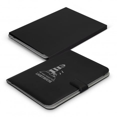Professional PU leather portfolio with a magnetic strap closure. It comes with an A4 lined pad, one main pocket, five business card holders, and one pen loop. It is presented in an individual black cardboard sleeve.