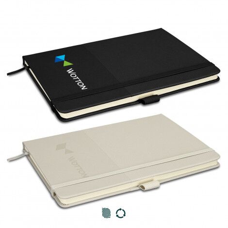 Made almost entirely from recycled materials, this stylish notebook features an RCS-certified recycled PU cover with a modern textured design. The inner pages are made from GRS-certified recycled lined paper perfect for lists, notes or keeping track of everyday plans. Enhanced with practical details including a ribbon bookmark, elastic closure band, and pen loop, it ensures your notes stay organised and accessible wherever you go.