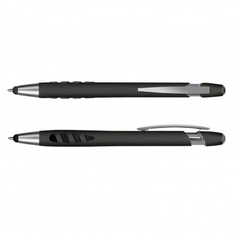 Retractable plastic ballpoint pen with a metallic barrel and soft rubber inserts in the grip. It has shiny chrome trim, a stylus, and a black refill with 1200 metres of German manufactured Dokumental ink.
