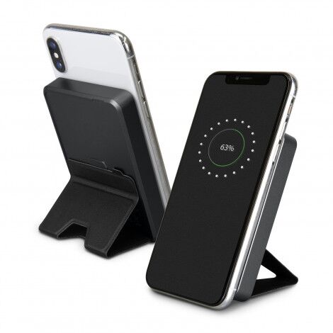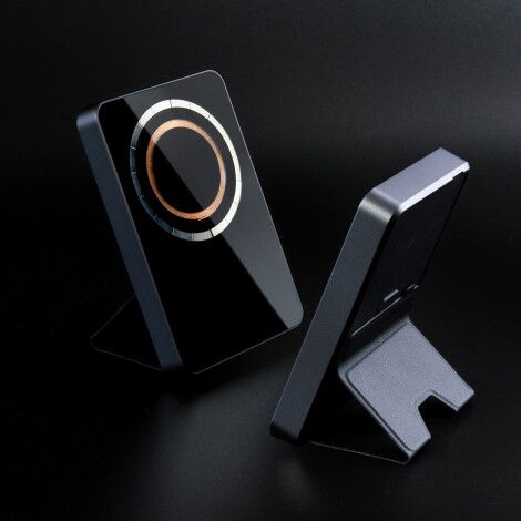 The Arc Wireless Charging Power Bank blends elegance with performance, offering stylish power on the go. Designed to seamlessly integrate into everyday life, it can charge up to two devices simultaneously with a wireless output of up to 15W. In addition, it comes with a metal ring for non MagSafe phones ensuring compatibility with any device. Additional features include LED power level and charging indicator lights, and a magnetic foldable stand that doubles as a non-slip base, offering hands-free convenience in both portrait and landscape positions. The sleek black glass finish, refined copper accents, and quality components make this compact and lightweight charger a standout accessory. Presented in a beautifully crafted INGENIO gift box, it is ideal for corporate gifting, and the ultimate brand statement. INGENIO – Designed to lead, built to last, made to inspire.