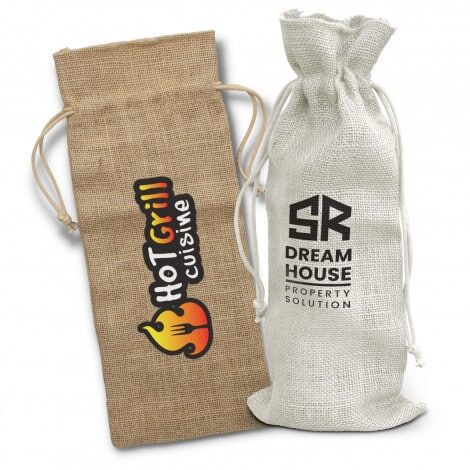 Natural unlaminated jute drawstring wine gift bag with cotton drawstrings.