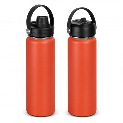 This BPA-free 800ml robust drink bottle is ideal for staying hydrated on the go. Combining stainless steel and polypropylene for a stylish drinking accessory. Available in eight vibrant colours, this double wall, vacuum insulated bottle features a powder coat finish and a secure screw on lid, with a choice of either a flip valve sipper, or a screw on chug cap. The Kinmont drink bottle blends practicality and style, highlighted by its carry handle and eye-catching silver rivet accents. This product is not dishwasher safe, and handwashing is recommended.