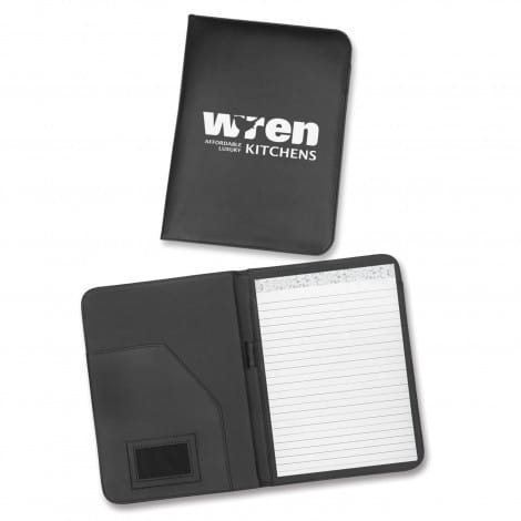 Large PU portfolio with a lined A4 pad and a pen loop. It laser engraves to a matt brown finish.