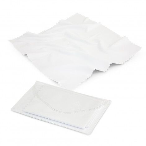 High quality microfibre cleaning cloth for lenses and screens in a handy clear pouch. Branding is on the pouch.