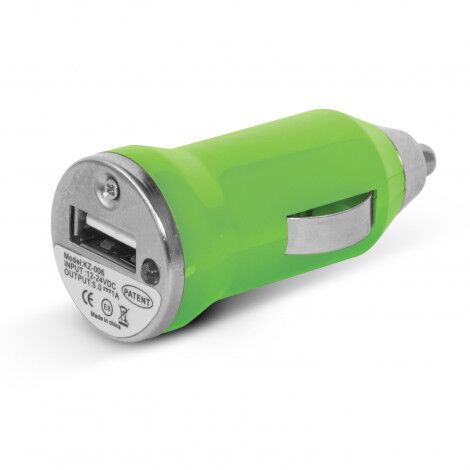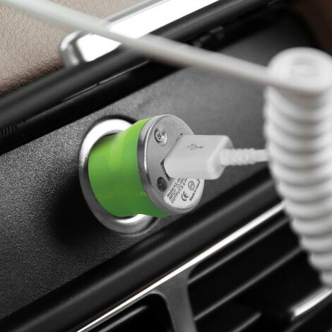 Compact 1 Amp car charger with an LED that lights up when it is in use.