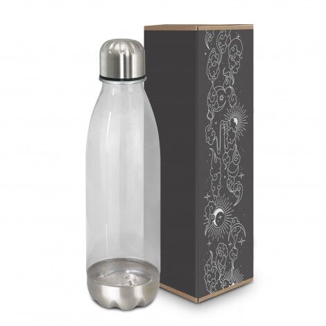 Trendy 700ml translucent drink bottle with a timeless design. It is manufactured from co-polyester which is odor-resistant and BPA-free. Mirage has a secure screw-on stainless steel lid, and a smart stainless steel base and can be presented in an optional black gift box. This product is not dishwasher safe and handwashing is recommended.