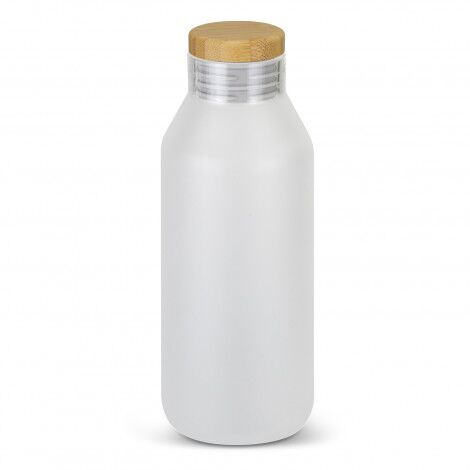 Elegant 600ml borosilicate glass drink bottle with a frosted finish and a natural bamboo lid. Borosilicate is lightweight, exceptionally strong and shatter-resistant. The bottle features a secure push on lid with a silicone seal and is presented in natural packaging with NATURA branding.