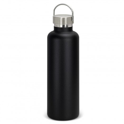 Robust 1L stainless steel, vacuum insulated drink bottle with a tough powder coated finish. The bottle features a stainless steel screw on lid with a convenient carry handle and the option of a bamboo panel. The bottle is presented in a black gift box.