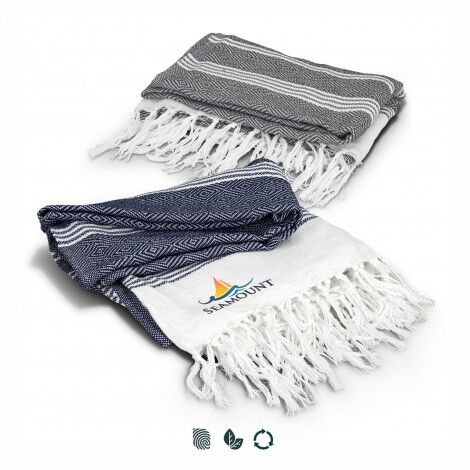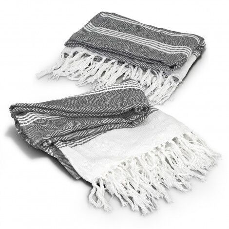 Trendy blanket manufactured from 500 GSM 50% Recycled Cotton, 50% polyester. It features a textured square pattern with a fringed trim.