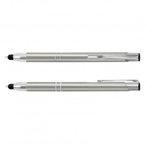 Retractable aluminium ball pen with an anodised barrel and shiny chrome accents. It has a stylus for use with touch screens and a black refill with 1000 metres of German manufactured Dokumental ink. The barrel laser engraves to an oxidised white colour and Panama can be presented in an optional sleeve or a gift box.
