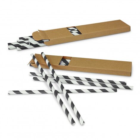 Set of 10 striped paper drinking straws which are presented in an unbleached cardboard box. Paper straws are an environmentally-conscious alternative to plastic straws and are a great way to send a positive message. Branding is on the box.
