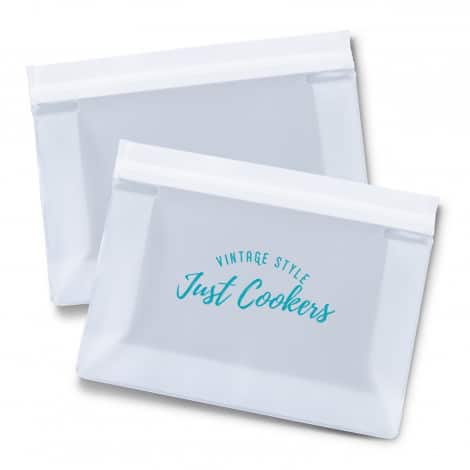 Handy reusable pouch for storing items such as food, passports, phones, or any tech accessories. The pouch is manufactured from vinyl with a sturdy zip-lock closure.