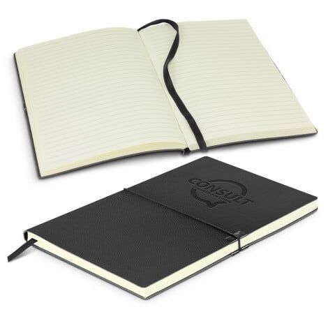 Smart medium-sized notebook with 80 leaves (160 pages) of 80gsm lined cream paper and a soft leather-look PU cover. It also features a bookmark ribbon and an elastic closure band that is secured by smart metal tabs on the cover.