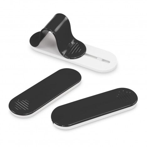 Slim phone grip that adheres securely to the back of a phone or phone case. It has a soft-touch plastic slider that moulds itself into a secure finger grip or a handy phone stand.