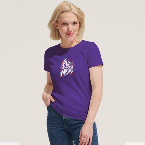 Stylish cut and sewn women’s t-shirt which features an elastane ribbed round collar with neck tape reinforcing and short sleeves. It is available in five sizes and is manufactured from 190gsm heavy jersey, semi combed ring spun cotton. This gives the garment a soft and smooth feel as well as providing an excellent branding surface.