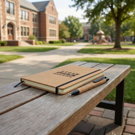 A coordinated notebook and pen set with a natural, modern look. The medium-sized (approximately A5) Somerset Notebook features a hard cover with a stylish cork finish, 80 leaves of lined cream paper, an elastic closure, and a bookmark ribbon. It is paired with the Inca Pen, featuring a natural cork barrel, soft-touch grip, and 1000 metres of black Dokumental ink for smooth, reliable writing. An optional paper belly band is available on request and can be branded in full colour. The notebook and pen set is presented in a natural gift box.