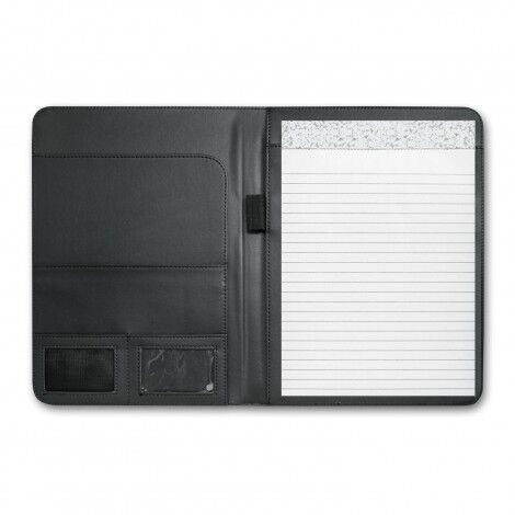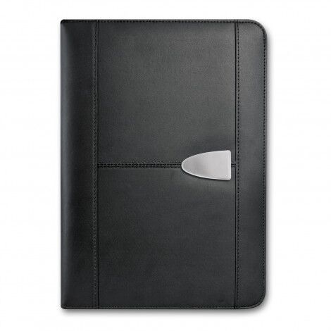 Superior large portfolio with a superb bonded leather cover. It has a lined A4 pad, a business card pocket and a pen loop. Sovrano has a unique metal centre plate which can be branded with the choice of a resin coated finish or a metal insert that laser engraves to a stainless steel finish. It can also be laser engraved directly onto the portfolio and can include individual names for an additional charge. The portfolio surface laser engraves to a matt brown finish.