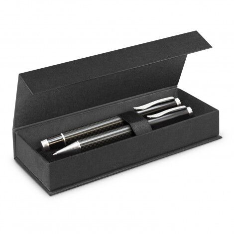 Premium gift set with a matching ball pen and rolling ball pen which can be beautifully presented in a matte black gift box. Both pens have genuine carbon fibre barrels and shiny chrome accents. The ball pen has a black large volume refill with 1800 metres of German manufactured Dokumental ink and a tungsten carbide ball for improved writing quality. The rolling ball pen has a refill with 1500 metres of black writing ink that will not dry out even if the cap isn’t replaced after use. The upper barrel of the ball pen and the cap of the rolling ball pen are manufactured from brass and laser engrave to a mirror finish.