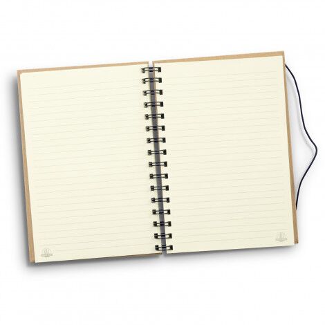 Stylish and functional medium-sized wiro-bound notebook with a hard kraft cover. The notebook features 80 leaves (160 pages) of 70gsm lined cream paper made using sugarcane waste, with a sugarcane logo printed on the inside cover and the corner of each page. An elastic closure helps to keep notes secure.